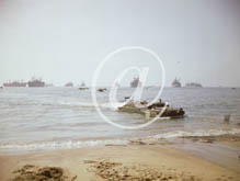 p023904 US Navy en couleurs - Série 80-GK- : Péniches de débarquements et véhicules amphibies atteignent la plage remplis de ravitaillement. cliquez pour accéder à sa fiche détaillée