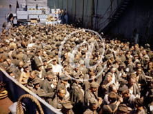 p023907 US Navy en couleurs - Série 80-GK- : Une foule de prisonniers de guerre allemands à bord d'un LCT en zone portuaire. cliquez pour accéder à sa fiche détaillée