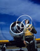 US Navy en couleurs - Série 80-GK- : Aviateur posant à coté d'un moteur d'avion.