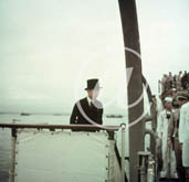 p024155 US Navy en couleurs - Série 80-GK- : Lors d' une cérémonie sur un cuirasé américain : un homme en costume noir de style XIXème siècle et chapaeu haut- de- forme. cliquez pour accéder à sa fiche détaillée